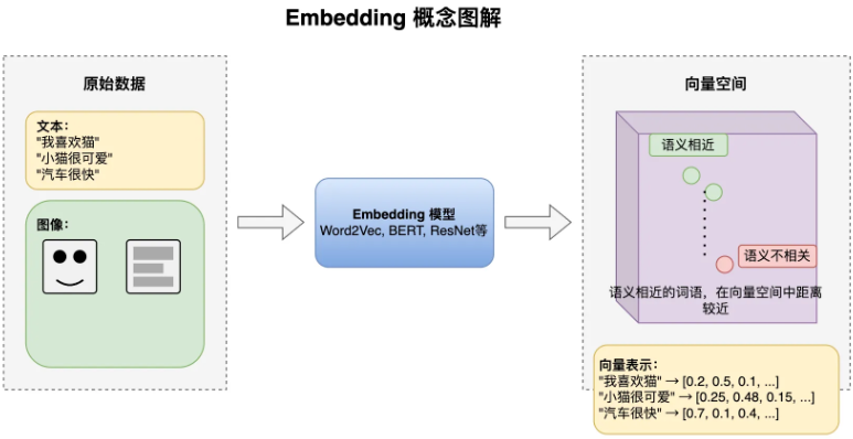 Embedding 嵌入是将高维离散数据(如文字、图片)转换为低维连续向量的过程。这些向量能在数学空间中表示原始数据的语义特征,使计算机能够理解数据间的相似性。