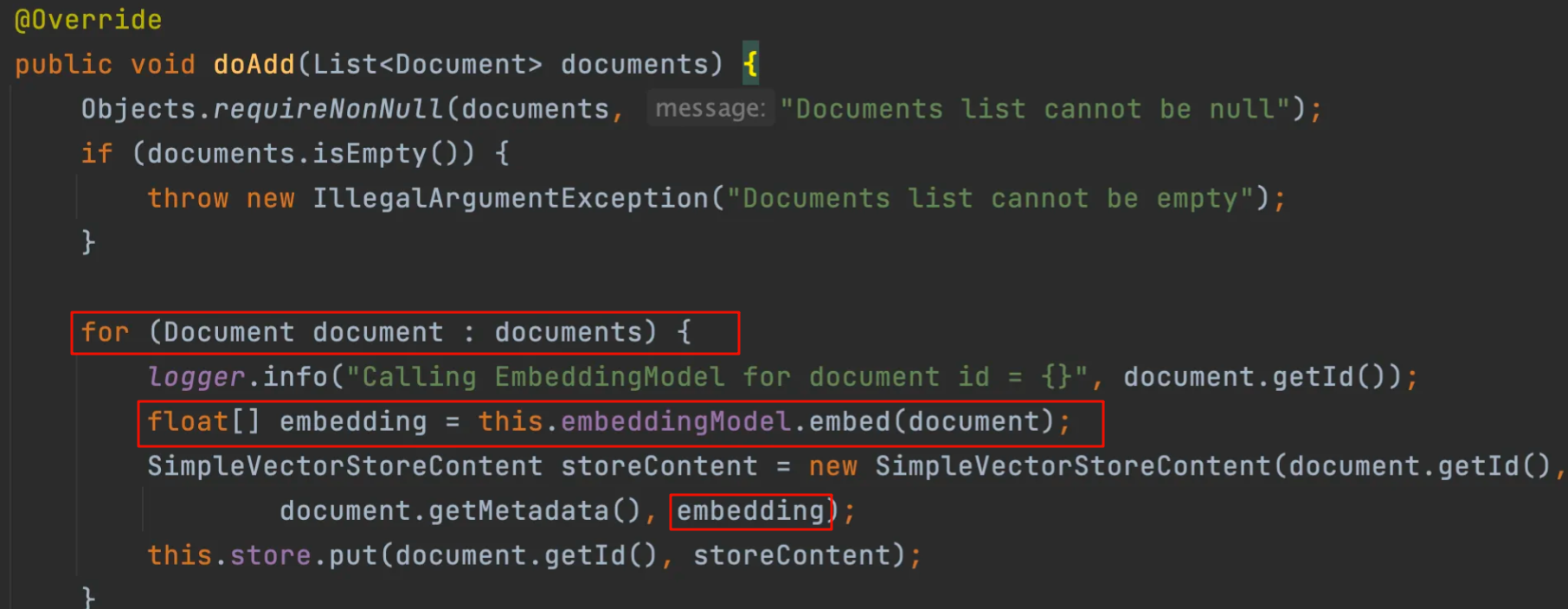 为了实现方便,我们先使用 Spring Al 内置的、基于内存读写的向量数据库 SimpleVectorStore 来保存文档。
