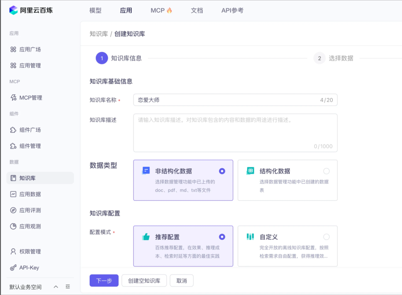 2>进入阿里云百炼平台的知识库,创建一个知识库,选择推荐配置即可: