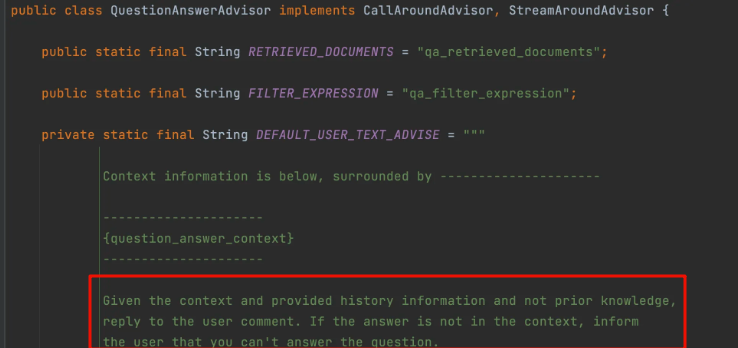 查看QuestionAnswerAdvisor源码,可以看到让Al基于知识库进行问答的Prompt: