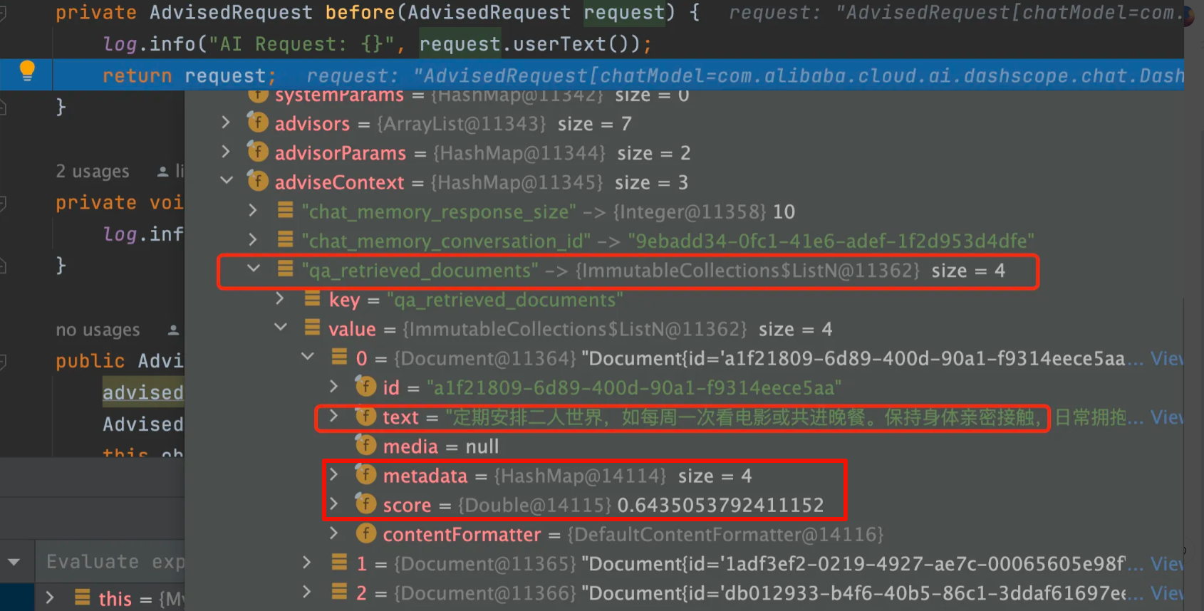 private VectorStore loveAppVectorStore;public String doChatWithRag(String message, String chatId) {ChatResponse chatResponse = chatClient.prompt().user(message).advisors(spec -> spec.param(CHAT_MEMORY_CONVERSATION_ID_KEY, chatId).param(CHAT_MEMORY_RETRIEVE_SIZE_KEY, 10))// 开启日志,便于观察效果.advisors(new MyLoggerAdvisor())// 应用知识库问答.advisors(new QuestionAnswerAdvisor(loveAppVectorStore)).call().chatResponse();String content = chatResponse.getResult().getOutput().getText();log.info("content: {}", content);return content;