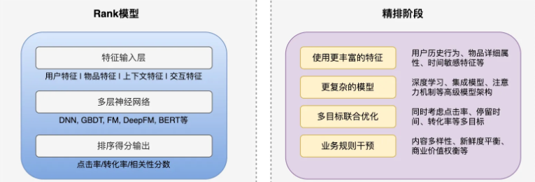 精排(精确排序)是搜索/推荐系统的最后阶段,使用计算复杂度更高的算法,考虑更多特征和业务规则,对少量候选项进行更复杂、精细的排序。