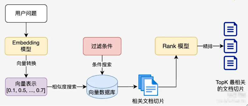 相似性搜索:在向量数据库中查找与问题向量最相似的文档块,常用的最相似搜索算法有余弦相似度、欧式距离等