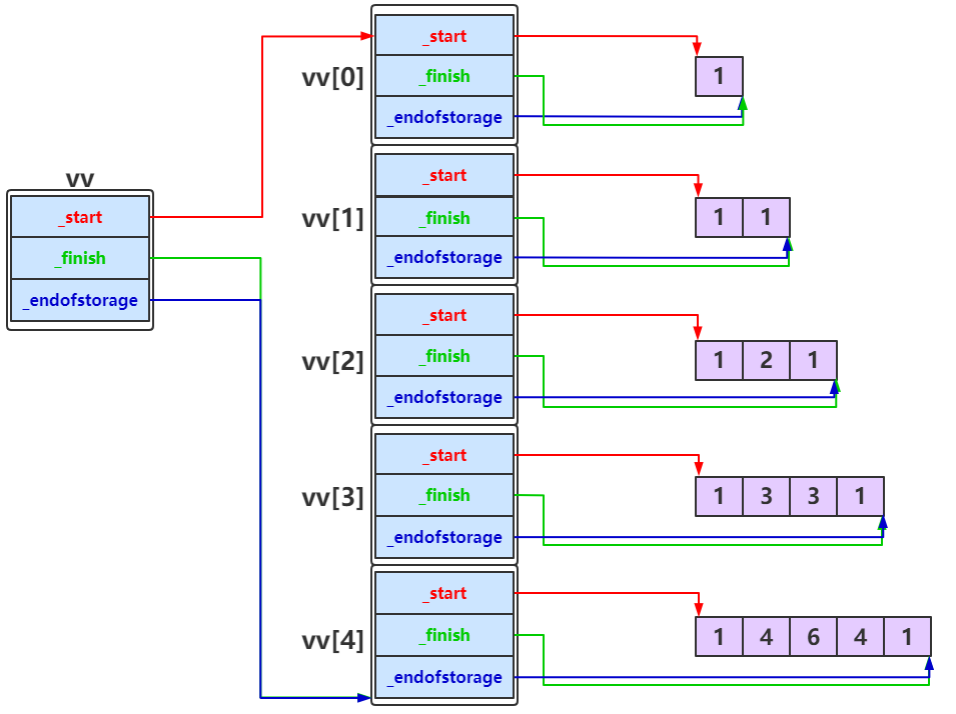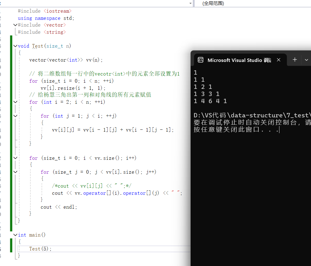 {vector<vector<int>> vv(n);// 将二维数组每一行中的vecotr<int>中的元素全部设置为1for (size_t i = 0; i < n; ++i)vv[i].resize(i + 1, 1);// 给杨慧三角出第一列和对角线的所有元素赋值for (int i = 2; i < n; ++i){for (int j = 1; j < i; ++j){vv[i][j] = vv[i - 1][j] + vv[i - 1][j - 1];}}for (size_t i = 0; i < vv.size(); i++){for (size_t j = 0; j < vv[i].size(); j++){/*cout << vv[i][j] << " ";*/cout << vv.operator[](i).operator[](j) << " ";}cout << endl;}