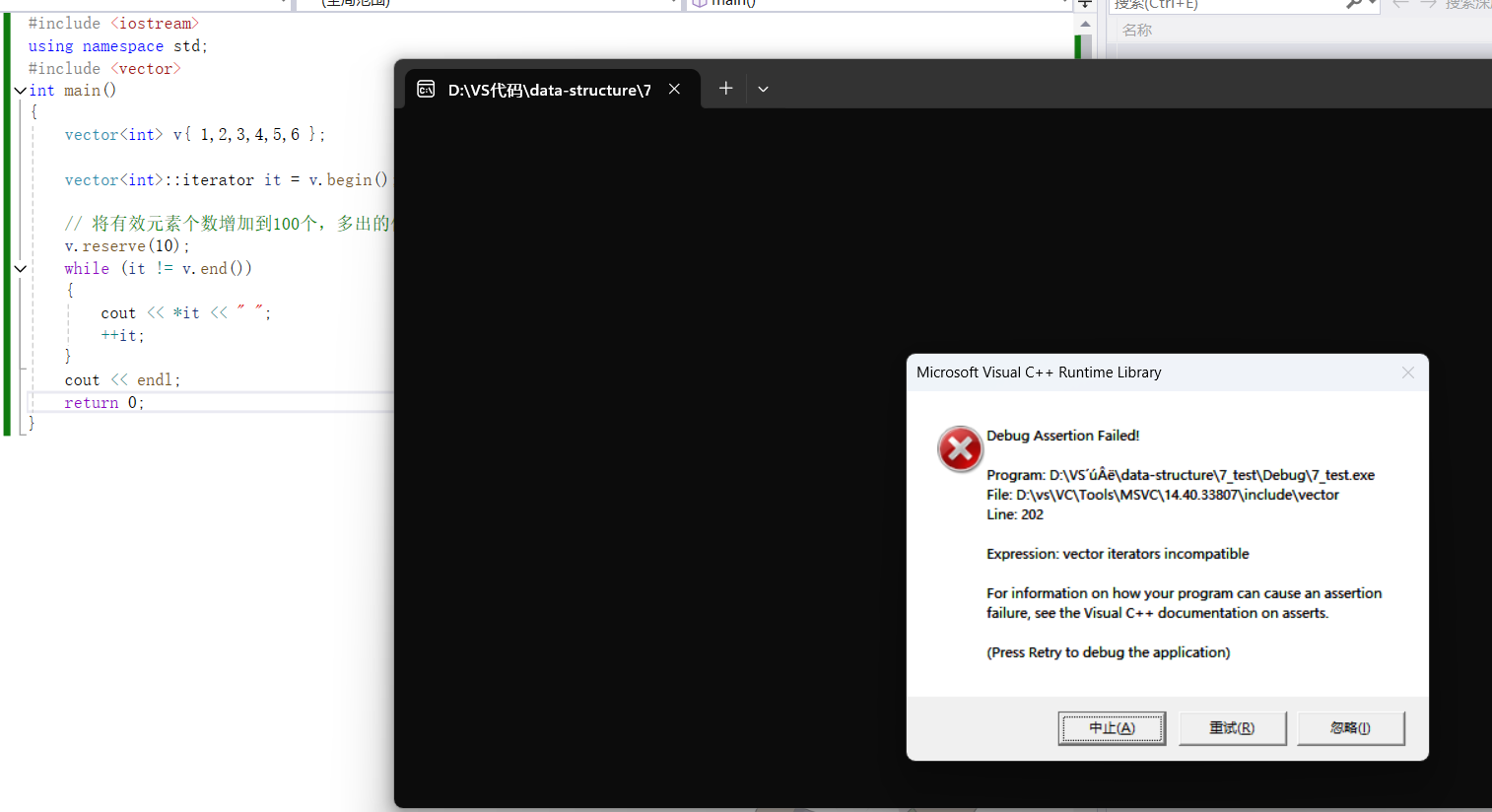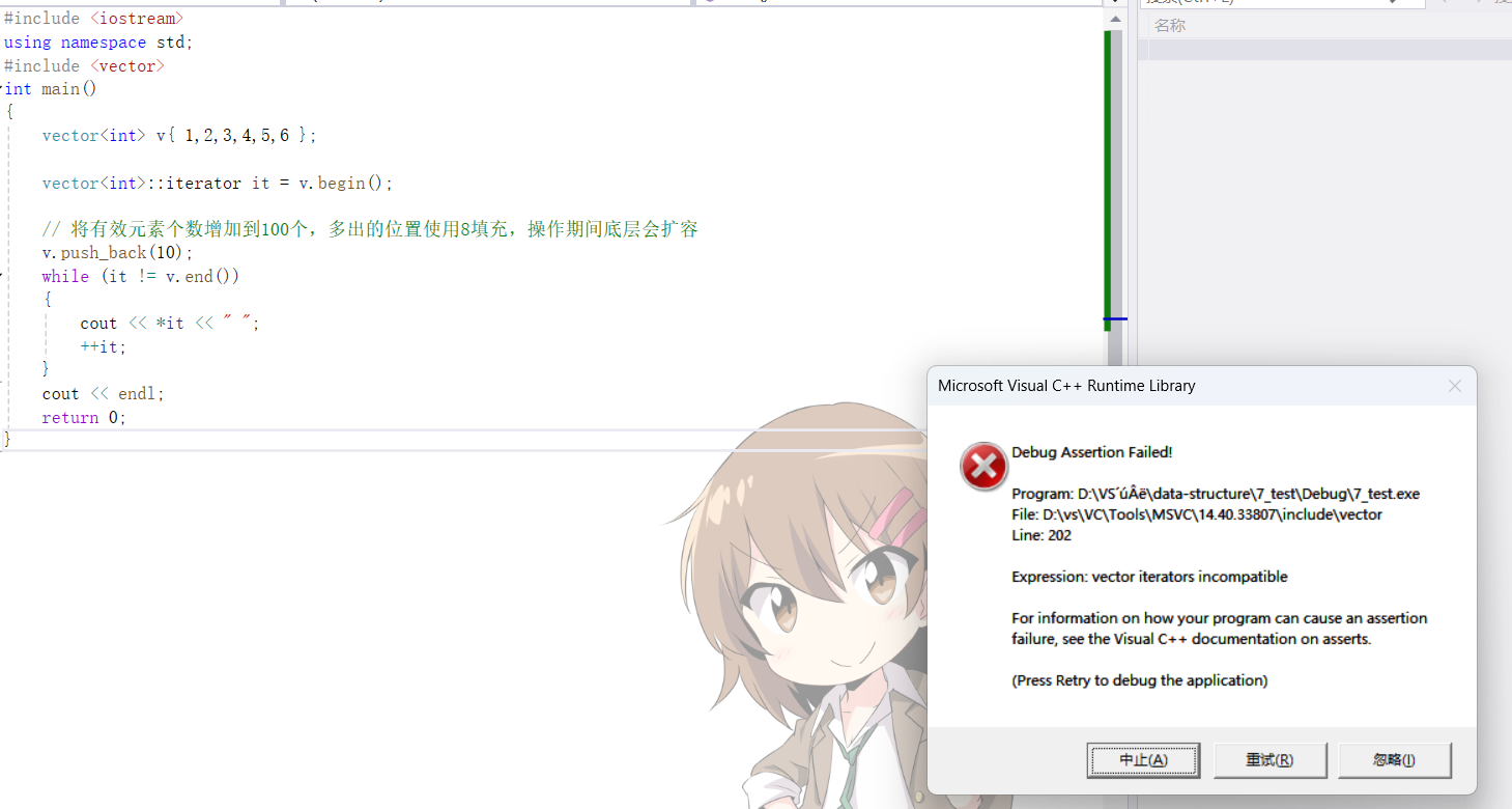{vector<int> v{ 1,2,3,4,5,6 };vector<int>::iterator it = v.begin();//插入元素期间,可能会引起扩容,而导致原空间被释放v.push_back(10);while (it != v.end()){cout << *it << " ";++it;}cout << endl;return 0;
