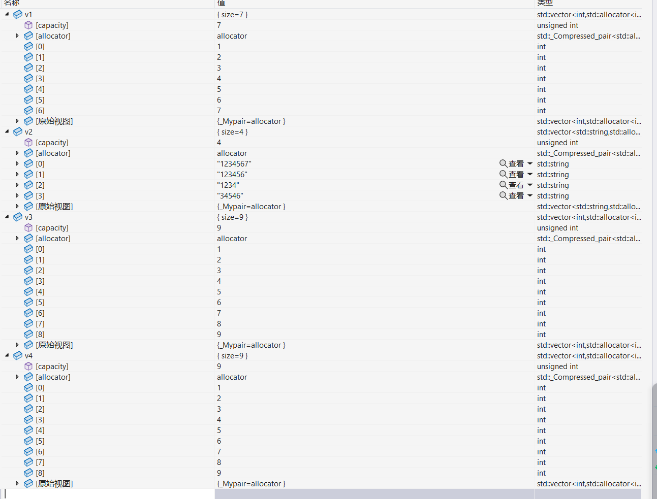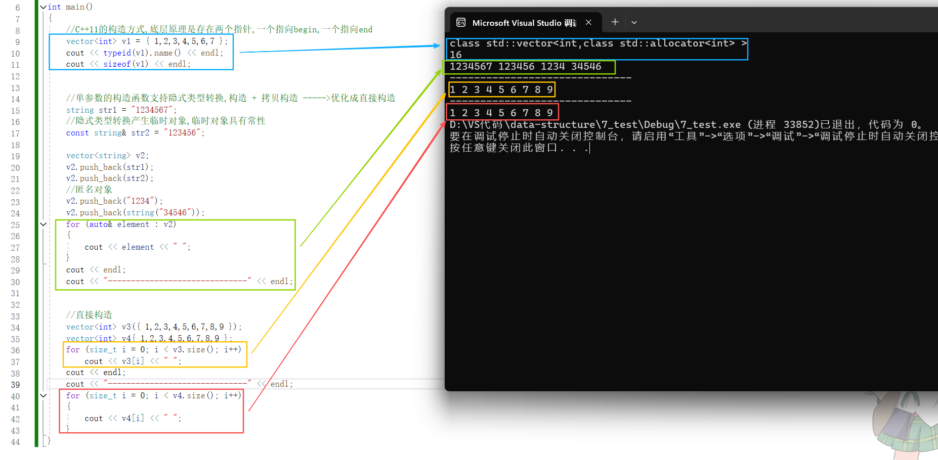 {//C++11的构造方式,底层原理是存在两个指针,一个指向begin,一个指向endvector<int> v1 = { 1,2,3,4,5,6,7 };cout << typeid(v1).name() << endl;cout << sizeof(v1) << endl;//单参数的构造函数支持隐式类型转换,构造 + 拷贝构造 ----->优化成直接构造string str1 = "1234567";//隐式类型转换产生临时对象,临时对象具有常性const string& str2 = "123456";vector<string> v2;v2.push_back(str1);v2.push_back(str2);//匿名对象v2.push_back("1234");v2.push_back(string("34546"));for (auto& element : v2){cout << element << " ";}cout << "------------------------------" << endl;cout << endl;//直接构造vector<int> v3({ 1,2,3,4,5,6,7,8,9 });vector<int> v4{ 1,2,3,4,5,6,7,8,9 };for (size_t i = 0; i < v3.size(); i++)cout << v3[i] << " ";cout << endl;cout << "------------------------------" << endl;for (size_t i = 0; i < v4.size(); i++){cout << v4[i] << " ";}