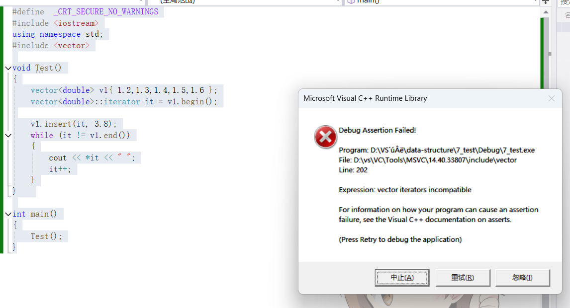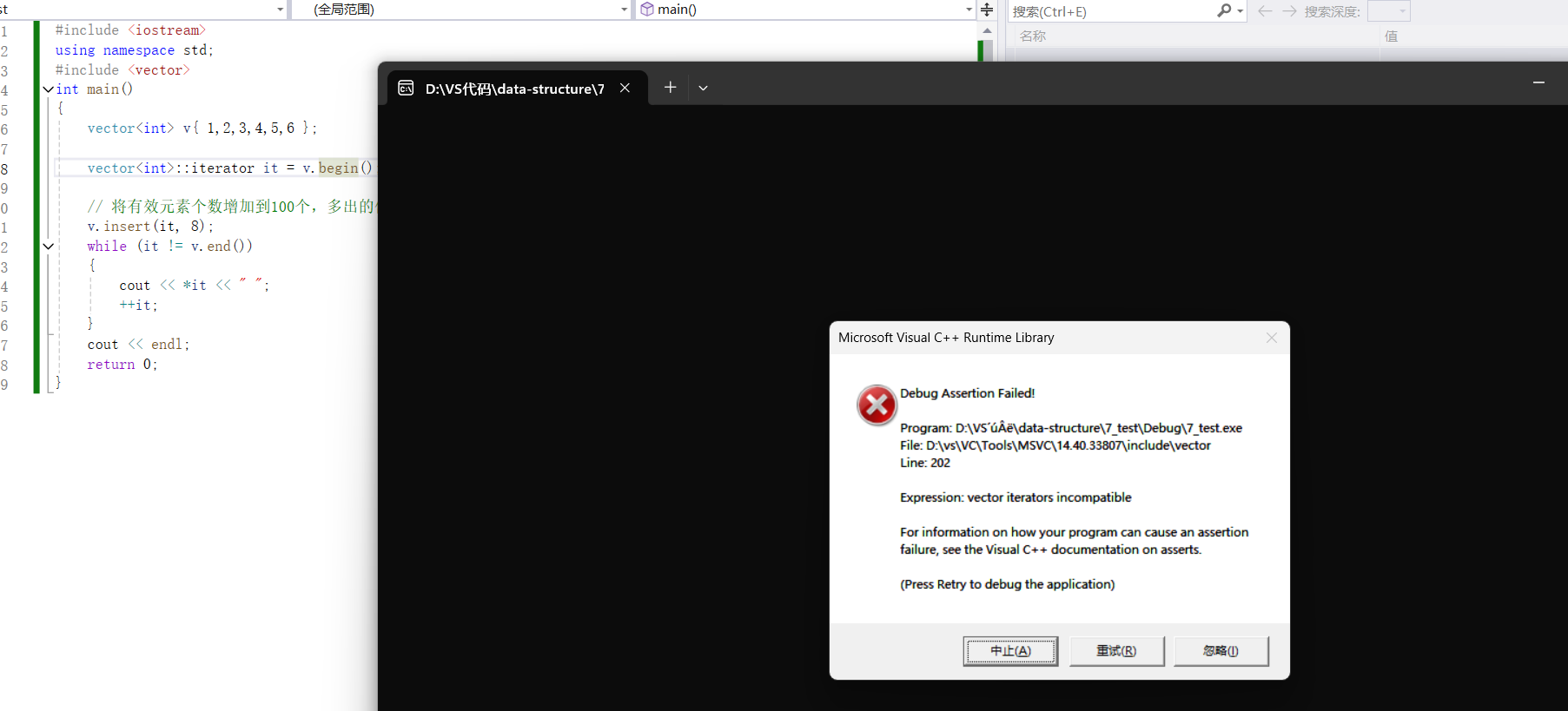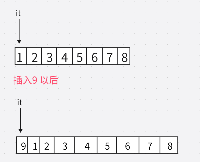 {vector<int> v{ 1,2,3,4,5,6 };vector<int>::iterator it = v.begin();//插入元素期间,可能会引起扩容,而导致原空间被释放v.insert(it, 8);while (it != v.end()){cout << *it << " ";++it;}cout << endl;return 0;