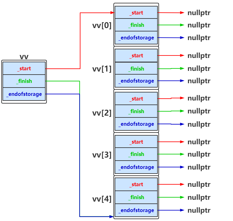 vector<vector<int>> vv(n); 构造一个vv动态二维数组,vv中总共有n个元素,每个元素都是vector类型的,每行没有包含任何元素,如果n为5时如下图所示.