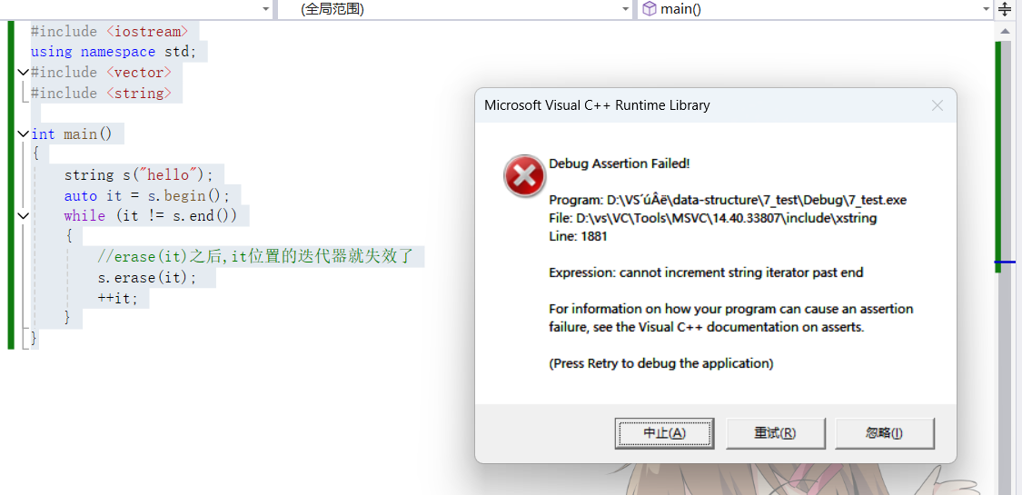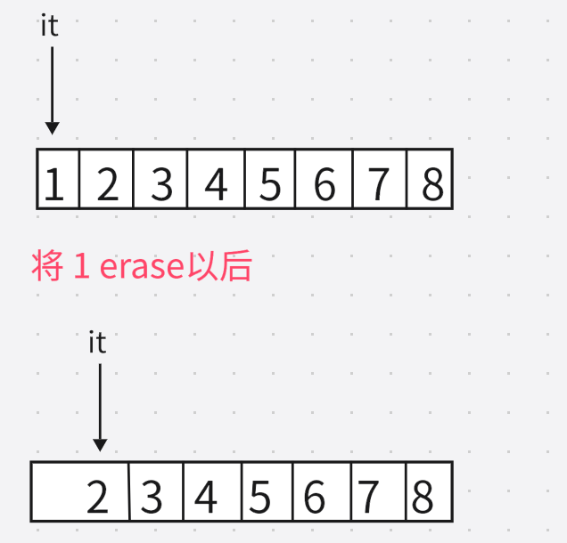 {string s("hello");auto it = s.begin();while (it != s.end()){//erase(it)之后,it位置的迭代器就失效了s.erase(it); ++it;}