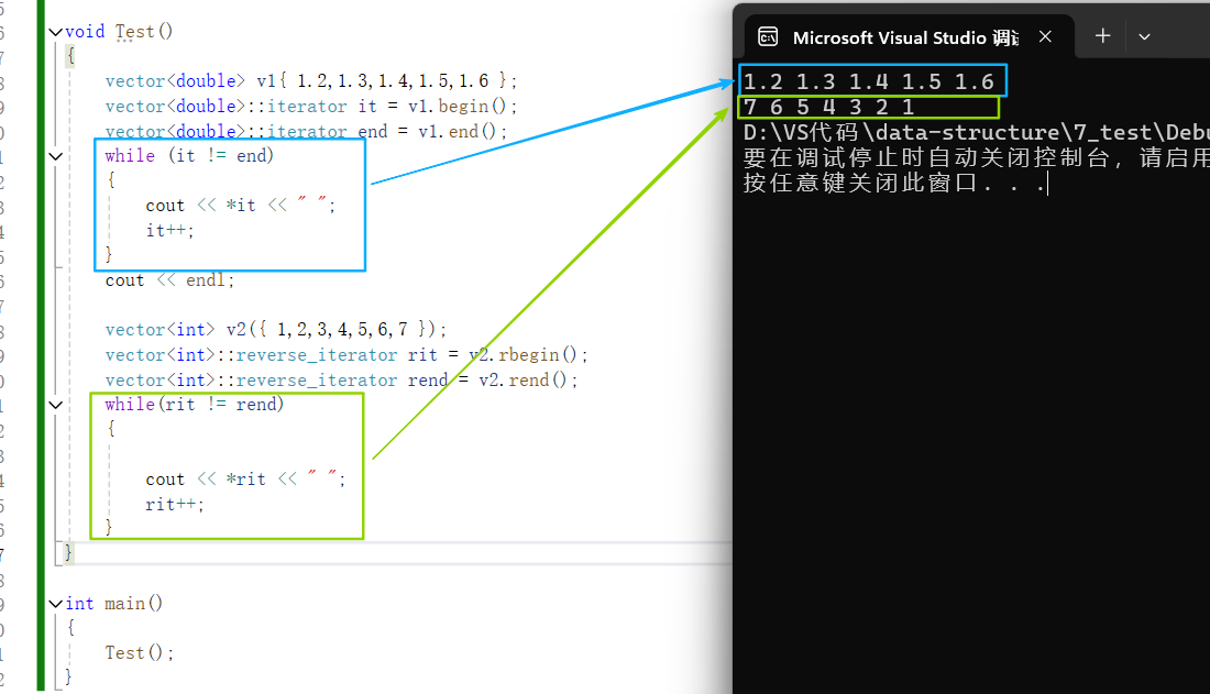 {vector<double> v1{ 1.2,1.3,1.4,1.5,1.6 };vector<double>::iterator it = v1.begin();vector<double>::iterator end = v1.end();while (it != end){cout << *it << " ";it++;}cout << endl;vector<int> v2({ 1,2,3,4,5,6,7 });vector<int>::reverse_iterator rit = v2.rbegin();vector<int>::reverse_iterator rend = v2.rend();while(rit != rend){cout << *rit << " ";rit++;}