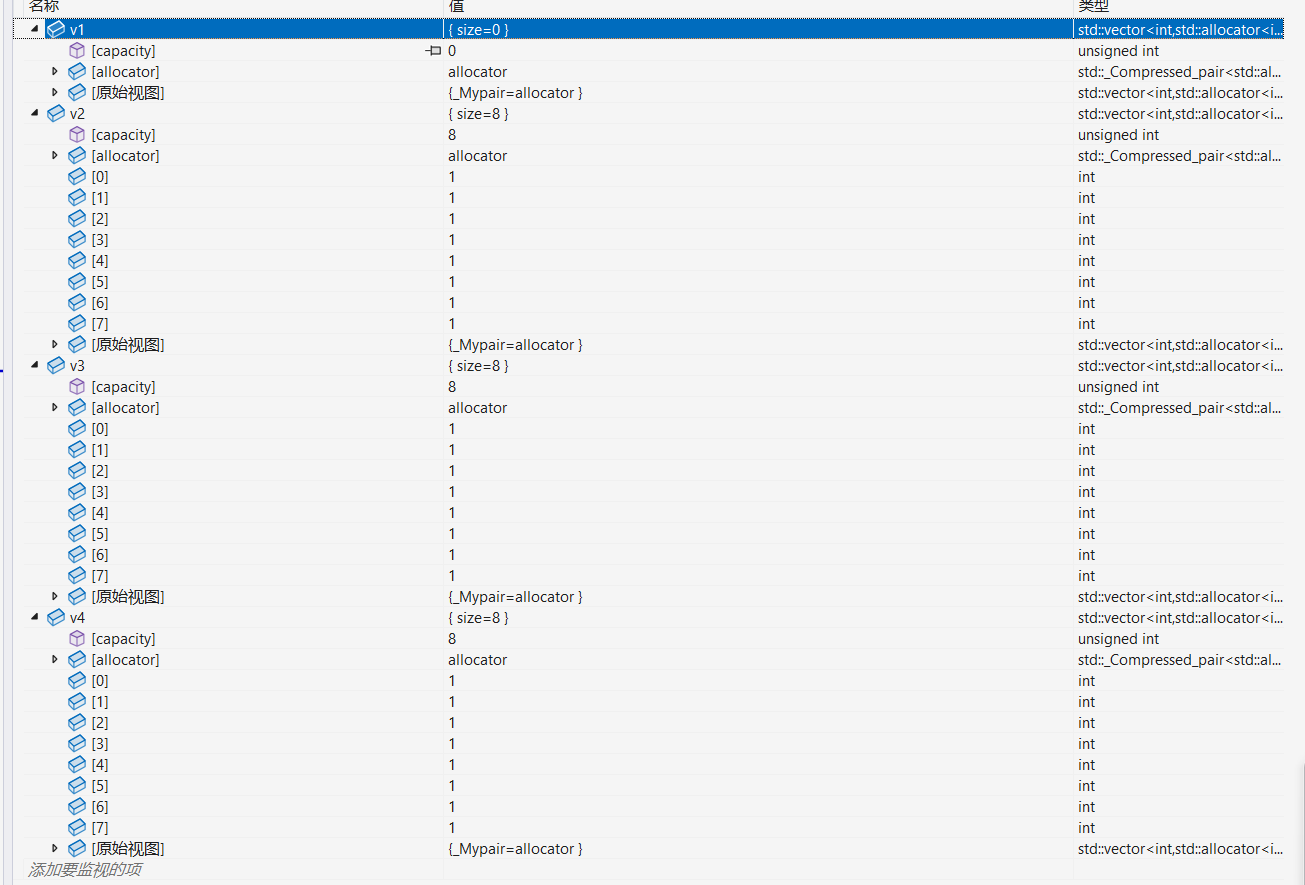 {//无参构造函数vector<int> v1;//构造并且初始化8个1vector<int> v2(8, 1);for (auto& element : v2)cout << element << " ";cout << endl;//使用v2对v3进行拷贝构造vector<int> v3(v2);for (auto& element : v3)cout << element <<" ";cout << endl;//使用迭代器进行构造vector<int> v4(v2.begin(), v2.end());for (auto& element : v4)cout << element << " ";cout << endl;return 0;
