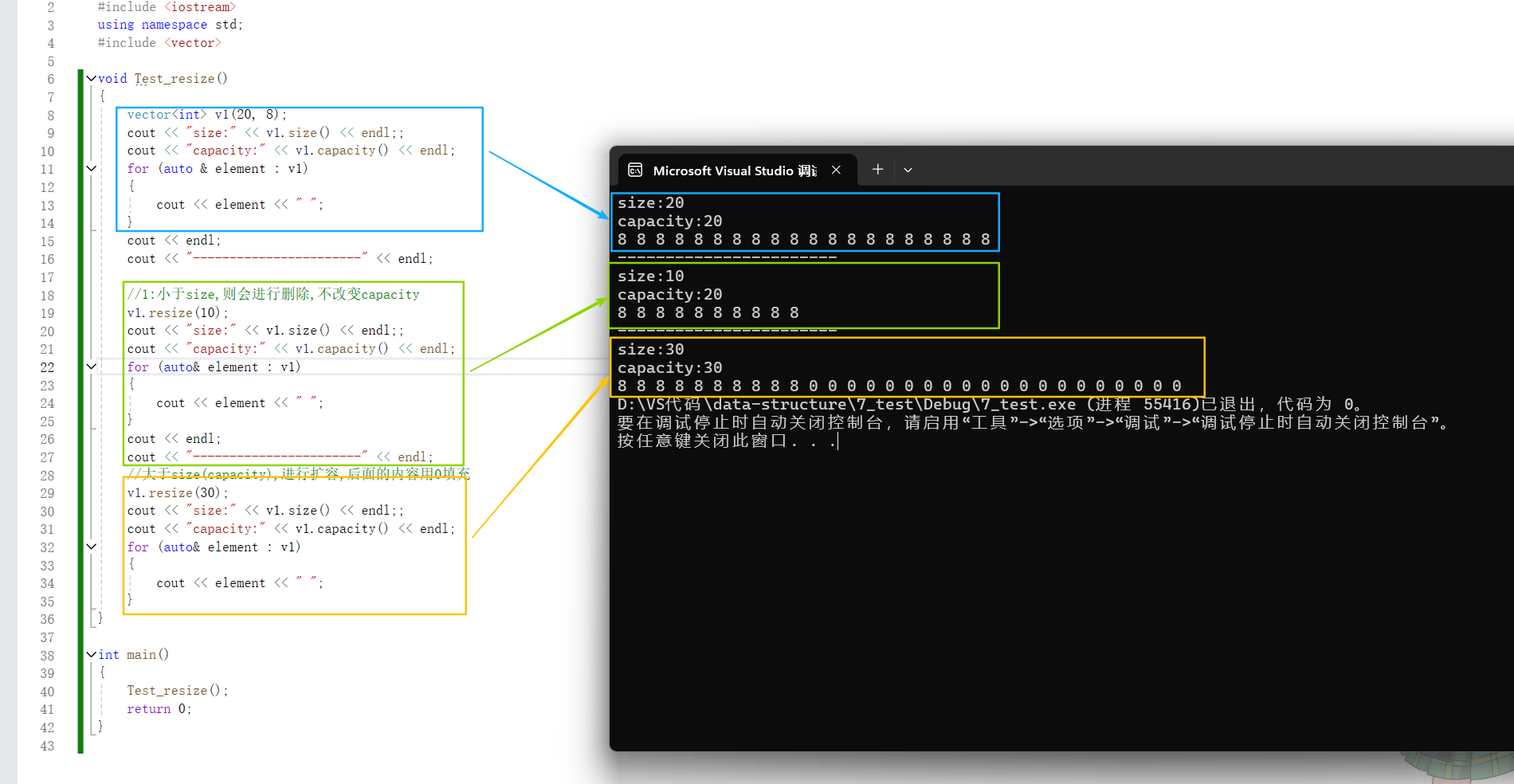 {vector<int> v1(20, 8);cout << "size:" << v1.size() << endl;;cout << "capacity:" << v1.capacity() << endl;for (auto & element : v1){cout << element << " ";}cout << endl;cout << "-----------------------" << endl;//1:小于size,则会进行删除,不改变capacityv1.resize(10);cout << "size:" << v1.size() << endl;;cout << "capacity:" << v1.capacity() << endl;for (auto& element : v1){cout << element << " ";}cout << endl;cout << "-----------------------" << endl;//大于size(capacity),进行扩容,后面的内容用0填充v1.resize(30);cout << "size:" << v1.size() << endl;;cout << "capacity:" << v1.capacity() << endl;for (auto& element : v1){cout << element << " ";}