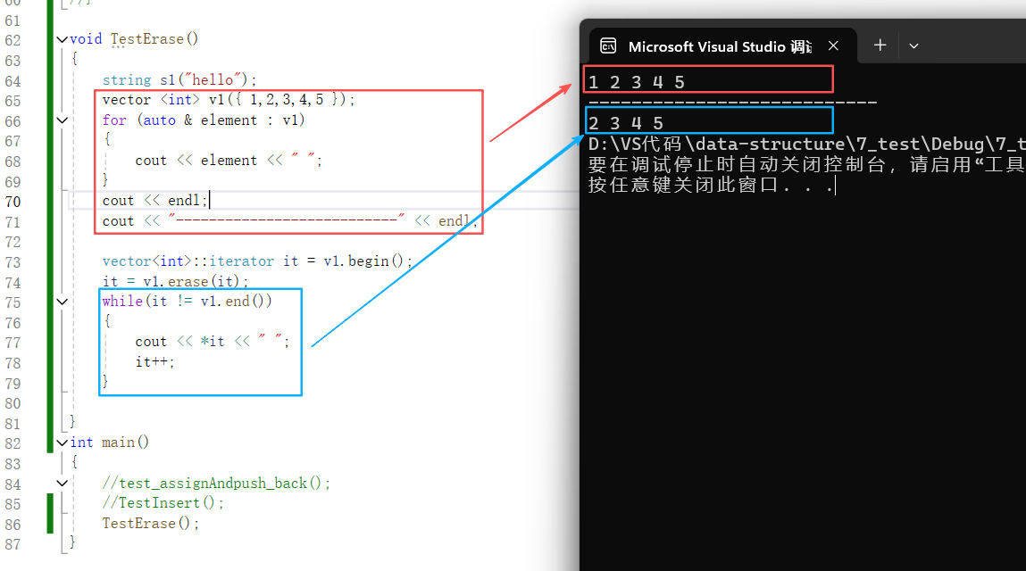 {string s1("hello");vector <int> v1({ 1,2,3,4,5 });for (auto & element : v1){cout << element << " ";}cout << endl;cout << "---------------------------" << endl;vector<int>::iterator it = v1.begin();it = v1.erase(it);while(it != v1.end()){cout << *it << " ";it++;}}