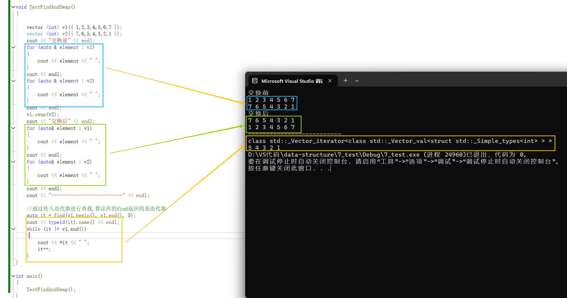 {vector <int> v1({ 1,2,3,4,5,6,7 });vector <int> v2({ 7,6,5,4,3,2,1 });cout << "交换前" << endl;for (auto & element : v1){cout << element << " ";}cout << endl;for (auto & element : v2){cout << element << " ";}cout << endl;v1.swap(v2);cout << "交换后" << endl;for (auto& element : v1){cout << element << " ";}cout << endl;for (auto& element : v2){cout << element << " ";}cout << endl;cout << "--------------------------" << endl;//通过传入迭代器进行查找,算法库的find返回的是迭代器auto it = find(v1.begin(), v1.end(), 5);cout << typeid(it).name() << endl;while (it != v1.end()){cout << *it << " ";it++;}
