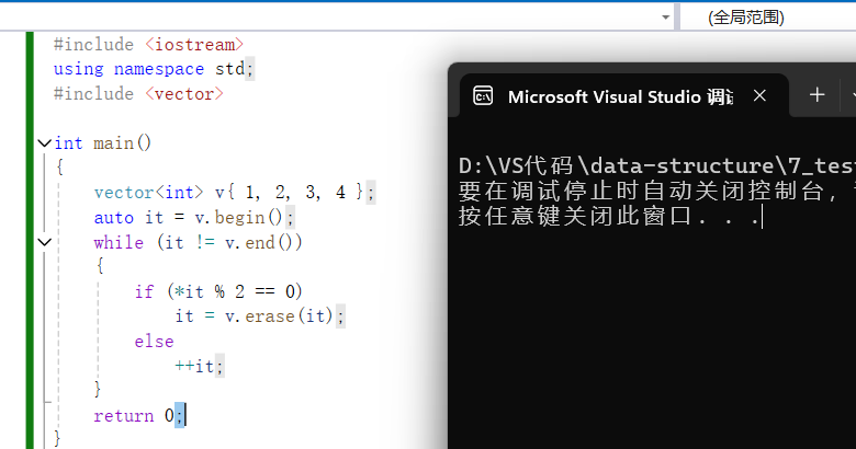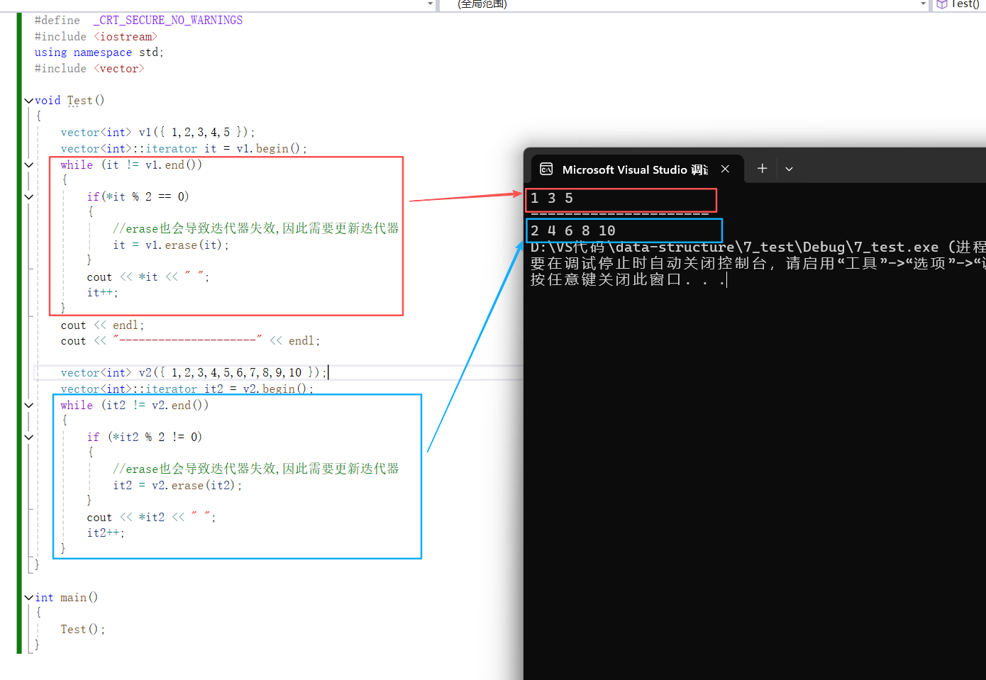 {vector<int> v1({ 1,2,3,4,5 });vector<int>::iterator it = v1.begin();while (it != v1.end()){if(*it % 2 == 0){//erase也会导致迭代器失效,因此需要更新迭代器it = v1.erase(it);}cout << *it << " ";it++;}cout << endl;cout << "---------------------" << endl;vector<int> v2({ 1,2,3,4,5,6,7,8,9,10 });vector<int>::iterator it2 = v2.begin();while (it2 != v2.end()){if (*it2 % 2 != 0){//erase也会导致迭代器失效,因此需要更新迭代器it2 = v2.erase(it2);}cout << *it2 << " ";it2++;}