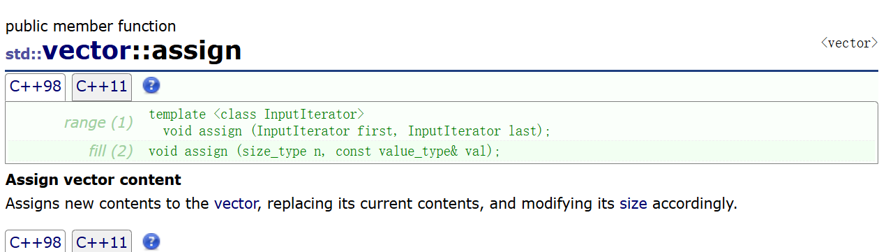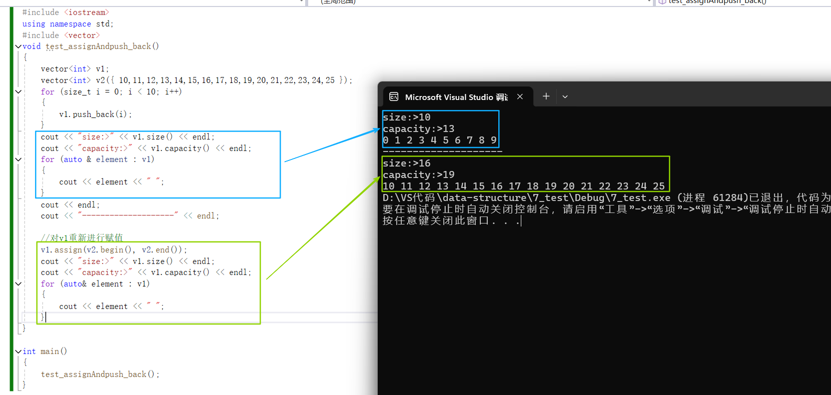 {vector<int> v1;vector<int> v2({ 10,11,12,13,14,15,16,17,18,19,20,21,22,23,24,25 });for (size_t i = 0; i < 10; i++){v1.push_back(i);}cout << "size:>" << v1.size() << endl;cout << "capacity:>" << v1.capacity() << endl;for (auto & element : v1){cout << element << " ";}cout << endl;cout << "--------------------" << endl;//对v1重新进行赋值v1.assign(v2.begin(), v2.end());cout << "size:>" << v1.size() << endl;cout << "capacity:>" << v1.capacity() << endl;for (auto& element : v1){cout << element << " ";}