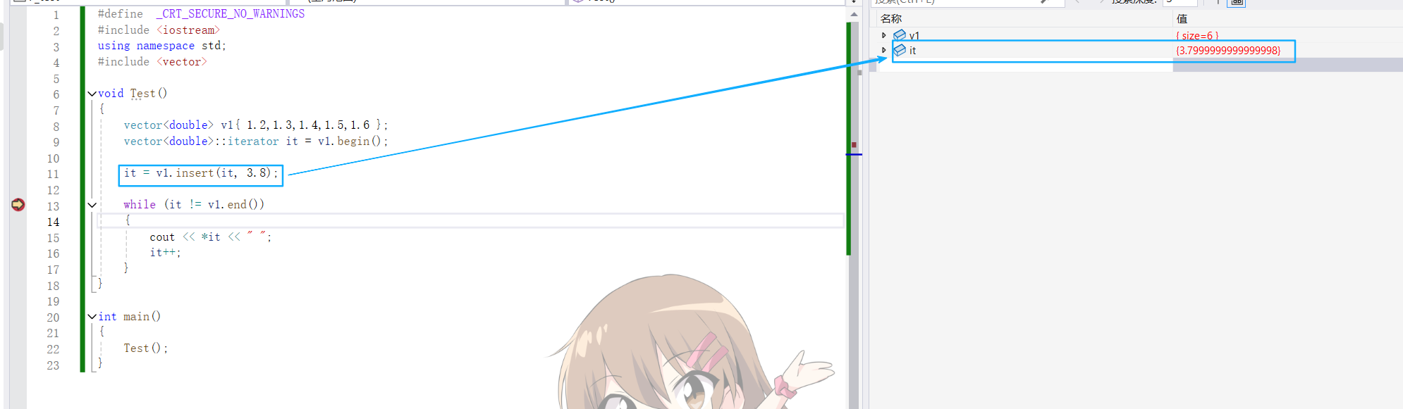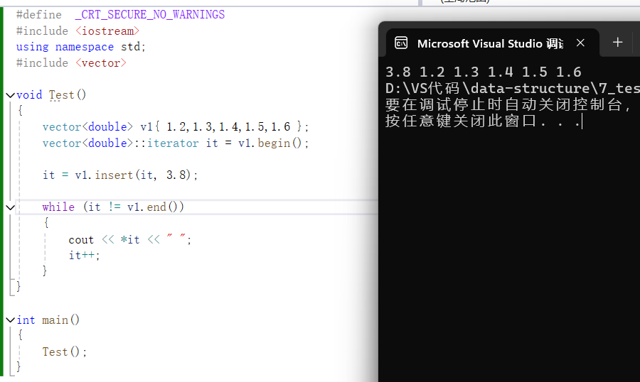 {vector<double> v1{ 1.2,1.3,1.4,1.5,1.6 };vector<double>::iterator it = v1.begin();it = v1.insert(it, 3.8);while (it != v1.end()){cout << *it << " ";it++;}