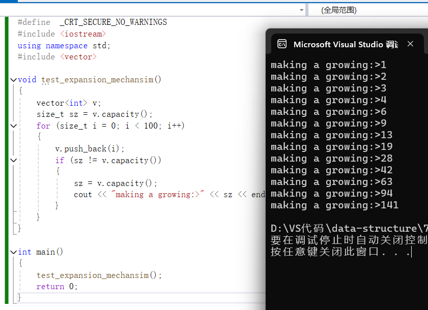 {vector<int> v;size_t sz = v.capacity();for (size_t i = 0; i < 100; i++){v.push_back(i);if(sz != v.capacity()){sz = v.capacity();cout << "making a growing:>" << sz << endl;}}