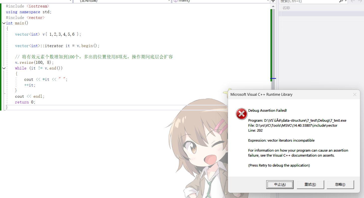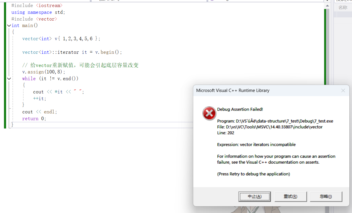 {vector<int> v{ 1,2,3,4,5,6 };vector<int>::iterator it = v.begin();// 给vector重新赋值,可能会引起底层容量改变v.assign(100,8);while (it != v.end()){cout << *it << " ";++it;}cout << endl;return 0;