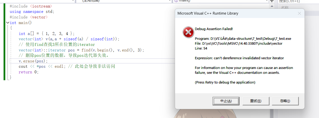 {int a[] = { 1, 2, 3, 4 };vector<int> v(a,a + sizeof(a) / sizeof(int));// 使用find查找3所在位置的iteratorvector<int>::iterator pos = find(v.begin(), v.end(), 3);// 删除pos位置的数据,导致pos迭代器失效。v.erase(pos);cout << *pos << endl; // 此处会导致非法访问return 0;