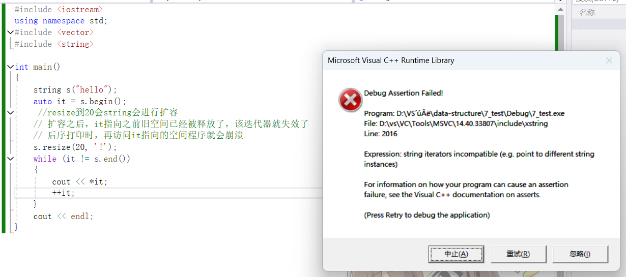 {string s("hello");auto it = s.begin();//resize到20会string会进行扩容// 扩容之后,it指向之前旧空间已经被释放了,该迭代器就失效了// 后序打印时,再访问it指向的空间程序就会崩溃s.resize(20, '!');while (it != s.end()){cout << *it;++it;}cout << endl;