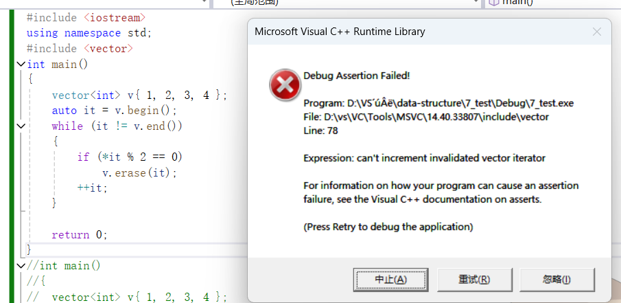 {vector<int> v{ 1, 2, 3, 4 };auto it = v.begin();while (it != v.end()){if (*it % 2 == 0)v.erase(it);++it;}return 0;