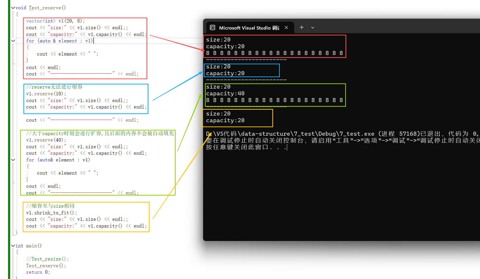 {vector<int> v1(20, 8);cout << "size:" << v1.size() << endl;;cout << "capacity:" << v1.capacity() << endl;for (auto & element : v1){cout << element << " ";}cout << endl;cout << "-----------------------" << endl;//reserve无法进行缩容v1.reserve(10);cout << "size:" << v1.size() << endl;;cout << "capacity:" << v1.capacity() << endl;cout << "-----------------------" << endl;//大于capacity时则会进行扩容,且后面的内容不会被自动填充v1.reserve(40);cout << "size:" << v1.size() << endl;;cout << "capacity:" << v1.capacity() << endl;for (auto& element : v1){cout << element << " ";}cout << endl;cout << "-----------------------" << endl;//缩容至与size相同v1.shrink_to_fit();cout << "size:" << v1.size() << endl;;cout << "capacity:" << v1.capacity() << endl;