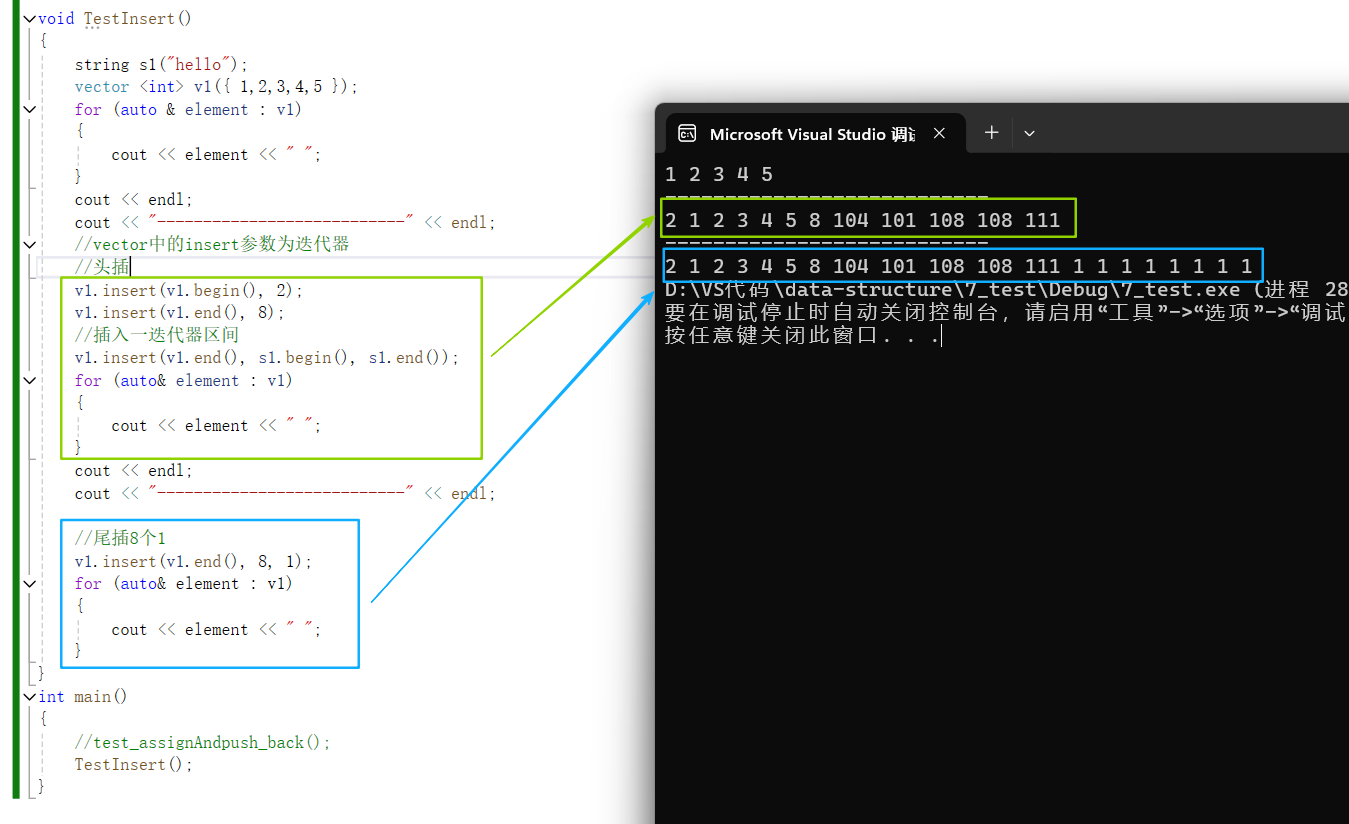 {string s1("hello");vector <int> v1({ 1,2,3,4,5 });for (auto & element : v1){cout << element << " ";}cout << endl;cout << "---------------------------" << endl;//vector中的insert参数为迭代器//头插v1.insert(v1.begin(), 2);v1.insert(v1.end(), 8);//插入一迭代器区间v1.insert(v1.end(), s1.begin(), s1.end());for (auto& element : v1){cout << element << " ";}cout << endl;cout << "---------------------------" << endl;//尾插8个1v1.insert(v1.end(), 8, 1);for (auto& element : v1){cout << element << " ";}