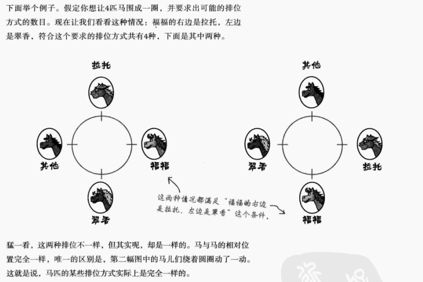 这一类问题该怎么解决呢?关键是把其中一匹马的位置固定下来,比如福福。只要福福站在某个位置上不动,就能计算其余3匹马的排位方式,这样就能避免重复计算,得出正确的结果。