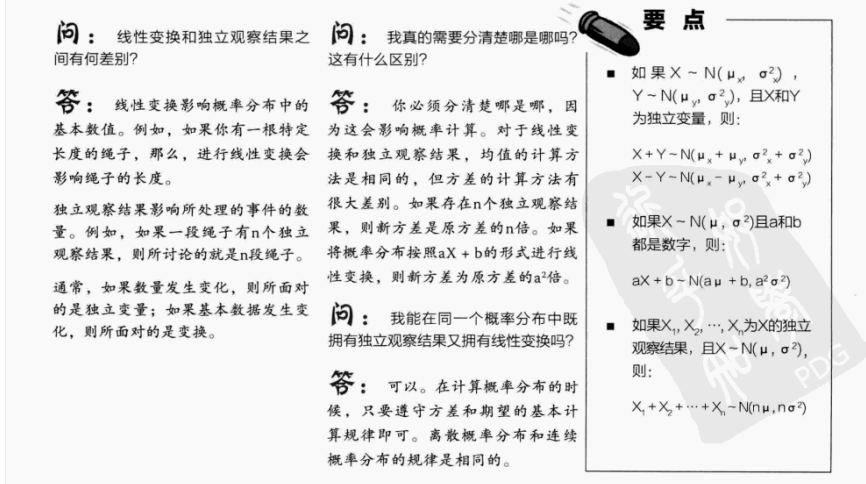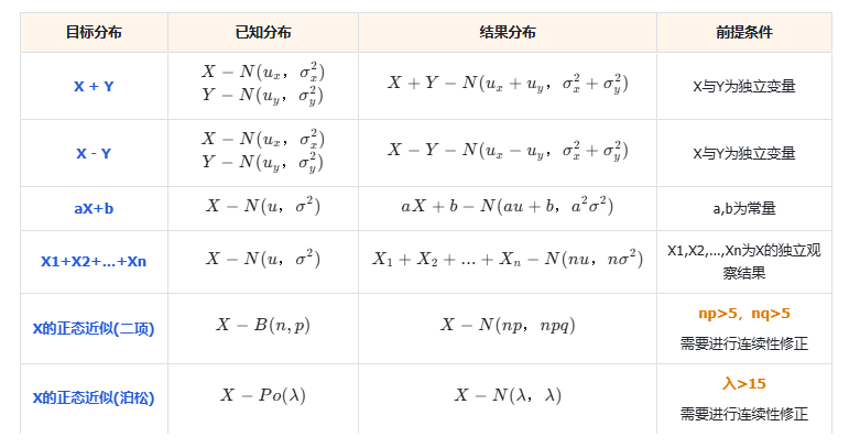 | 独立正态变量的和 / 差 | 若X-N(u_x,σ_x^2)、Y-N(u_y,σ_y^2)且独立,则: X+Y-N(u_x+u_y,σ_x^2+σ_y^2)、X-Y-N(u_x-u_y,σ_x^2+σ_y^2) |