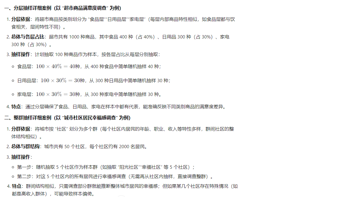 | 简单随机抽样 | 从总体中随机选取样本,所有可能的样本被选中的概率相同 分为重复抽样(抽样单位放回)和不重复抽样(抽样单位不放回) | - 重复抽样:街头随机采访行人(可能重复采访同一人) - 不重复抽样:检验口香糖球(尝过的糖球不放回) |