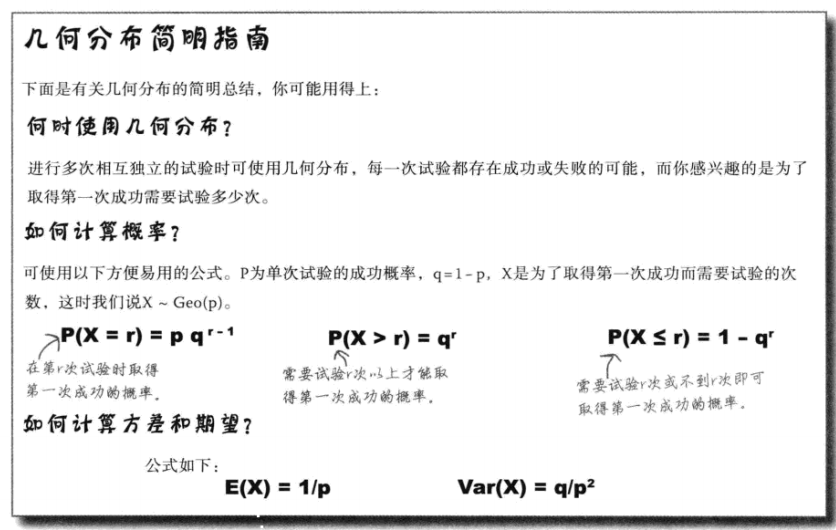 | | 取得第一次成功需要试验r次或以下的概率 | | 根据{P(X>r)} + {P(X \leqslant r)} =1推导而来。因两种概率类型是对立事件 |