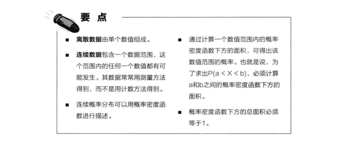 | 概率(连续分布) | 连续随机变量在某一数值范围的概率等于其概率密度函数在该范围下方的面积,总面积(总概率)为 1 |