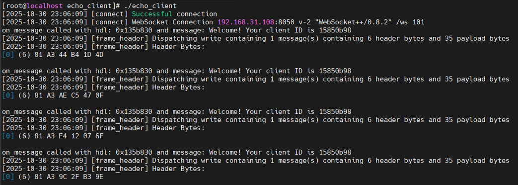 重新编译echo_client.cpp,运行,可以看到echo_client和WebSocket Server连接并通讯上了:
