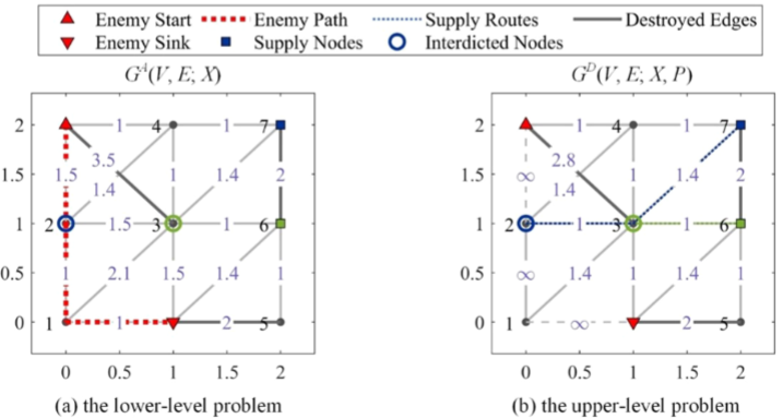 问题描述基于双层决策框架(BDAM),在防御者和攻击者的博弈中优化防御策略。防御者通过摧毁边缘和部署战斗单位于节点来阻止攻击者的进攻,同时确保战斗单位得到后勤支持。由于资源有限,防御者只能摧毁最多R条边并依赖供应节点支持特定的拦截节点。模型考虑了节点和边的限制,以保证实际可操作性。攻击者根据防御者的策略选择最短路径,而防御者则通过最大化攻击者路径长度并最小化供应路线长度来优化其决策。