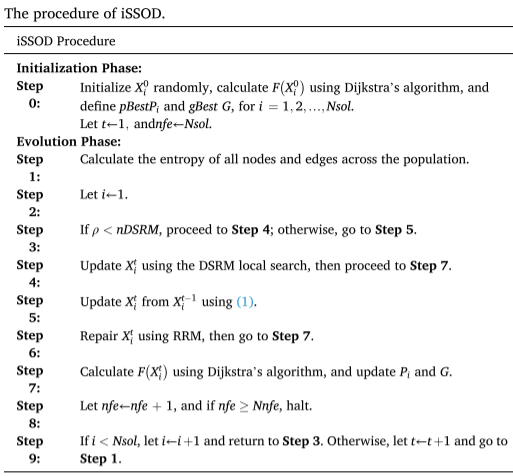 iSSOD算法通过全局探索和局部优化相结合,优化拦截部署、边缘破坏和供应路径,在资源约束下求解问题。上层问题使用基于SSO元启发式算法,每个解编码了完整的防御策略,包括节点拦截、边缘摧毁和供应分配决策。随机修复机制(RRM)确保解的可行性,考虑到供应能力和摧毁约束。下层通过迪杰斯特拉算法计算攻击者的最短路径,有效评估防御策略的效果。为了加强局部优化,采用基于熵的局部搜索机制(DSRM),根据节点和边的关键性和接近攻击者路径的程度调整策略。iSSOD的初始化阶段生成随机解,每个解包含两个部分:拦截-供应分配向量和边缘摧毁向量。模型通过编码防御配置来表示解,并展示了网络变化过程。