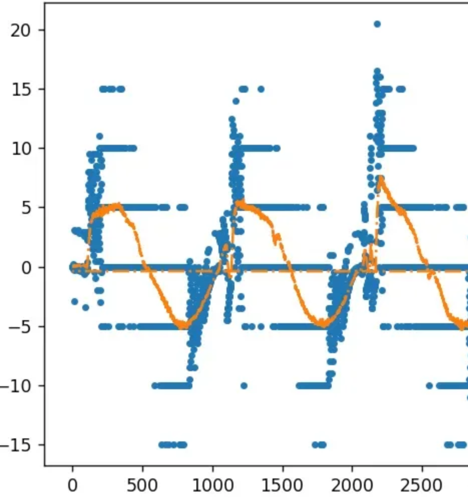 卡尔曼滤波计算量小、效果明显和无需保存历史数据,适合实时信号处理。下图为某次电机运转后,电机速度的原始图像和卡尔曼滤波后的曲线图(橘红色为滤波后曲线,蓝色为原始曲线)。