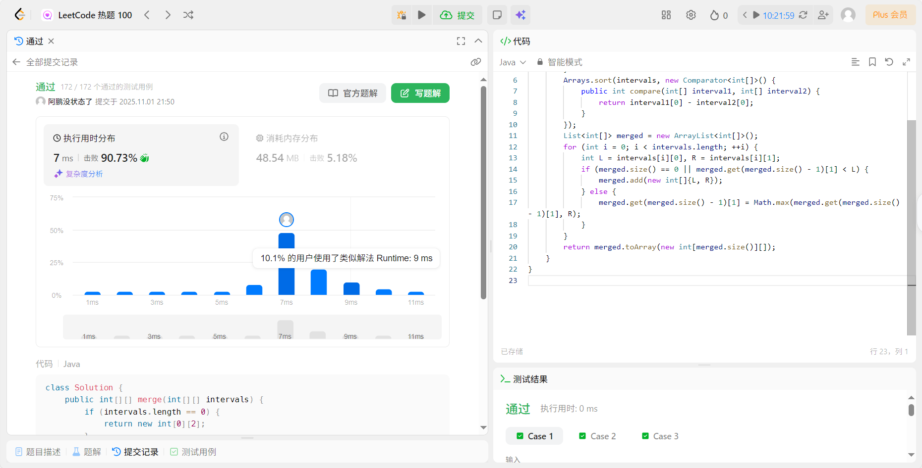 class Solution {public int[][] merge(int[][] intervals) {if (intervals.length == 0) {return new int[0][2];}Arrays.sort(intervals, new Comparator<int[]>() {public int compare(int[] interval1, int[] interval2) {return interval1[0] - interval2[0];}});List<int[]> merged = new ArrayList<int[]>();for (int i = 0; i < intervals.length; ++i) {int L = intervals[i][0], R = intervals[i][1];if (merged.size() == 0 || merged.get(merged.size() - 1)[1] < L) {merged.add(new int[]{L, R});} else {merged.get(merged.size() - 1)[1] = Math.max(merged.get(merged.size() - 1)[1], R);}}return merged.toArray(new int[merged.size()][]);}