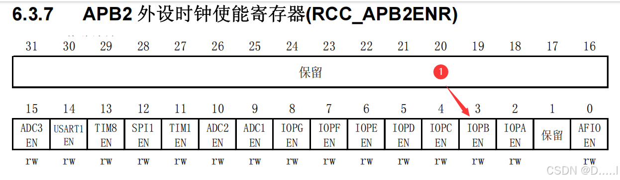 - GPIOB 对应使用控制寄存器是 APB2ENR