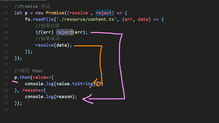 let p = new Promise((res,rej)=>{fs.readFile('./resource/text.txt',(err,data)=>{if(err) rej(err)res(data)})