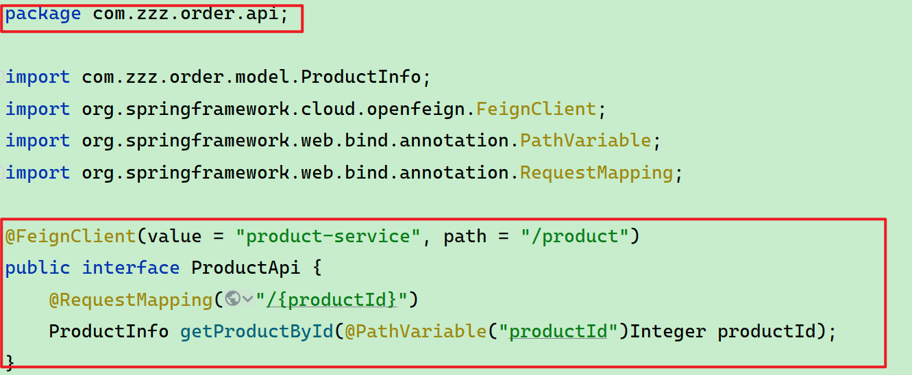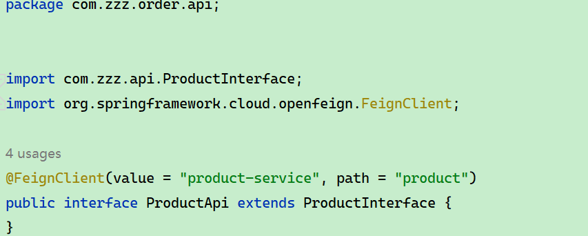 在 order-service 中创建 api 包,包下创建 ProductApi 接口类