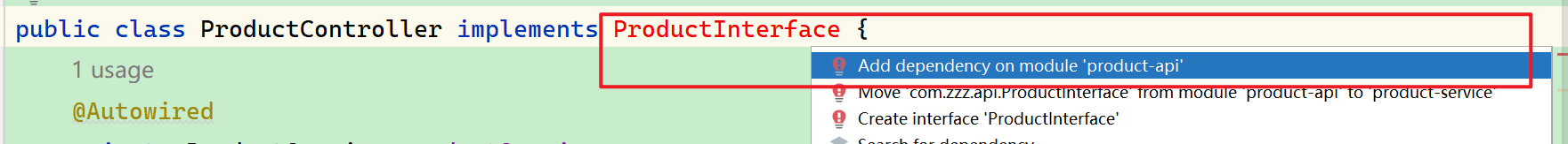 但我们这个接口的定义是在其他模块中,由于刚刚已经打成了 jar 包放在了我们的本地 maven 仓库中,所以当我们使用快捷键修复的时候,会自动提示我们添加依赖~~