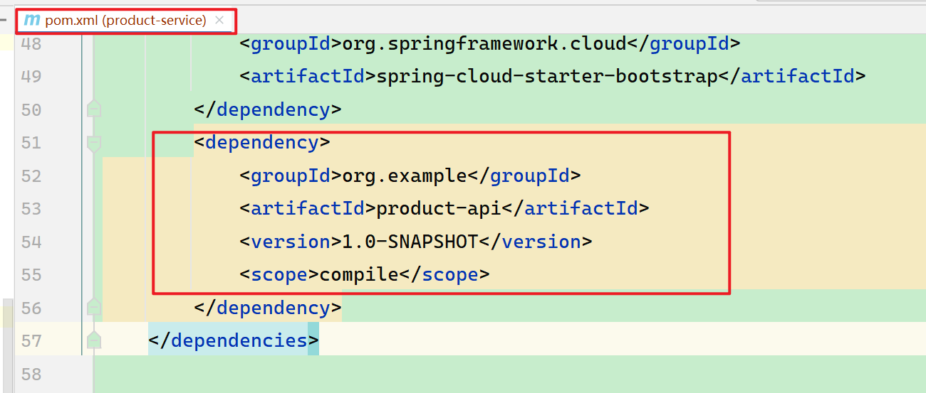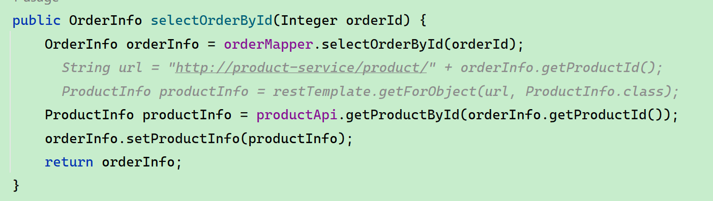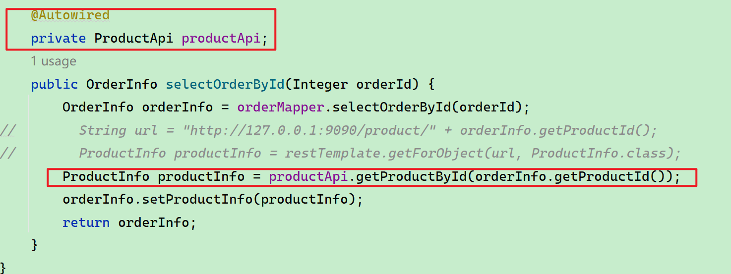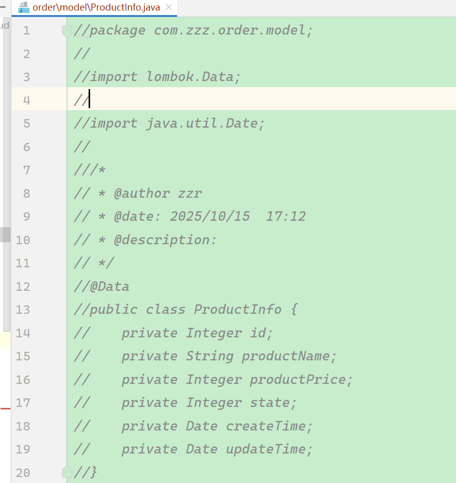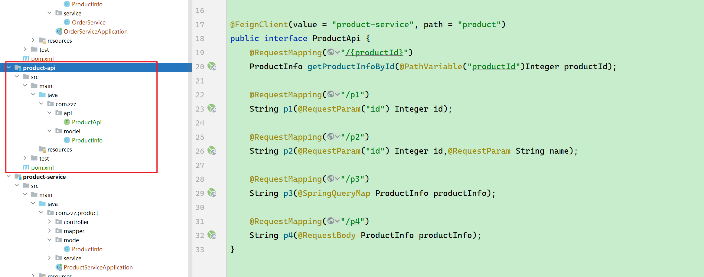 因为 order-service 和 product-service 中都需要 ProductInfo,所以我们直接将其提取出来在 product-api,然后就可以将之前两个模块重点 ProductInfo 全部注释掉了~~