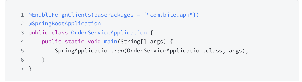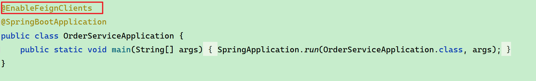 在 order-service 的启动类添加注解 @EnableFeginClients,开启 OpenFeign 的功能