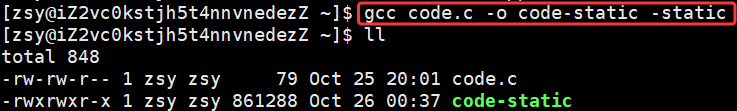 接下来就可以通过静态链接来生成可执行文件:gcc code.c -o code-static -static