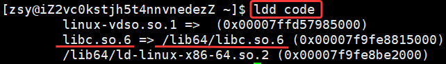 动态链接其实远⽐静态链接要常⽤得多。⽐如我们查看下 code 这个可执⾏程序依赖的动态库,会发现它就⽤到了⼀个c动态链接库:ldd code