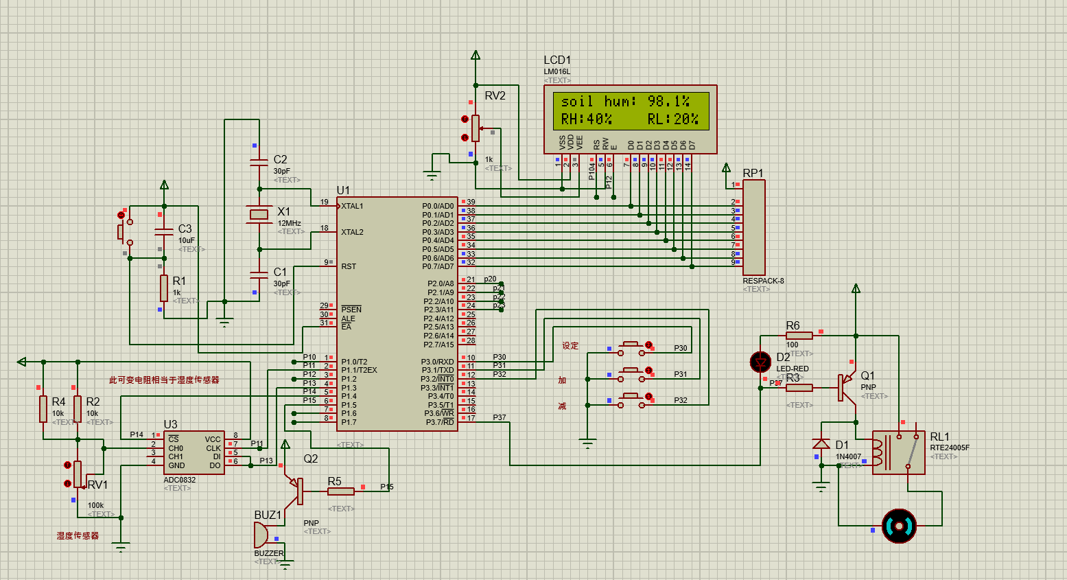 3、土壤湿度值低于下限时,蜂鸣器报警并驱动水泵浇水