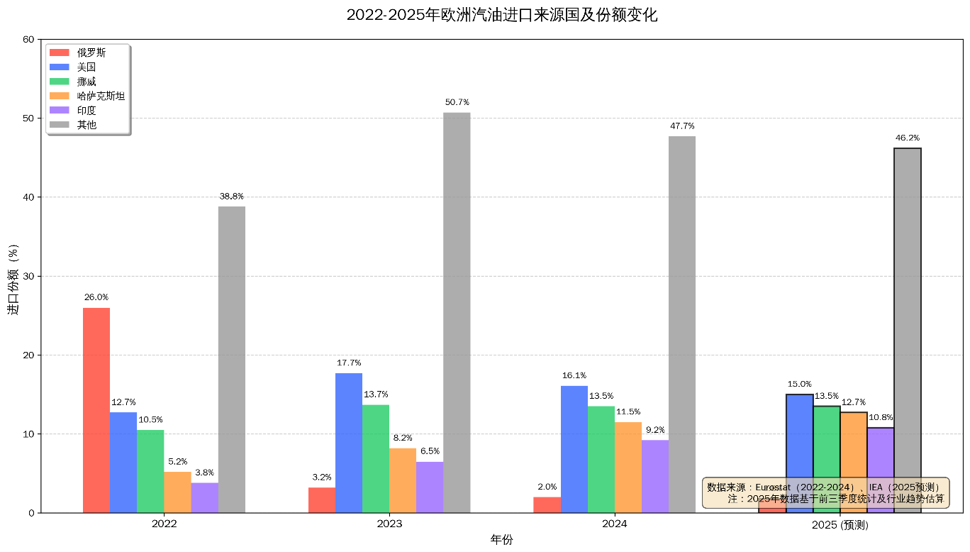 未来 1-2 年,俄罗斯汽油供应的核心变量是炼厂修复进度(若 2026 年能恢复 90% 产能,或可逐步解除出口禁令);欧洲将持续推进能源多元化,对俄能源依赖度进一步降至 3% 以下;中国则可依托产能与通道优势,持续扩大在全球成品油市场的份额,实现 “进口优化 + 出口增收” 的双向收益。