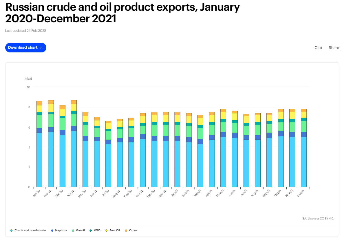 答案是否定的,虽然俄罗斯石油出口总量很大,但是同学们从下图中可看出俄罗斯出口能源比例关系,其出口量大多数为原油。如下图中所示:2021年12月出口总石油量:7.8 百万桶/天,其中原油和凝析油占5 mb/d(百万桶/天),占64%。而石油产品出口中汽油的量完全没有按照单独一项列举,仅包含在“其他”项中,从俄罗斯海关总署统计及IEA报告可以确认,2021年俄罗斯汽油出口量仅约440万吨,折合每天约8.8万桶/天,约仅占其出口总额的1%(占比很小)。