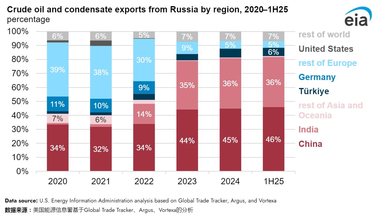 [2] 美国能源信息署(EIA). 俄罗斯原油及凝析油出口地区分布分析(2020-2025)[R]. 2025.